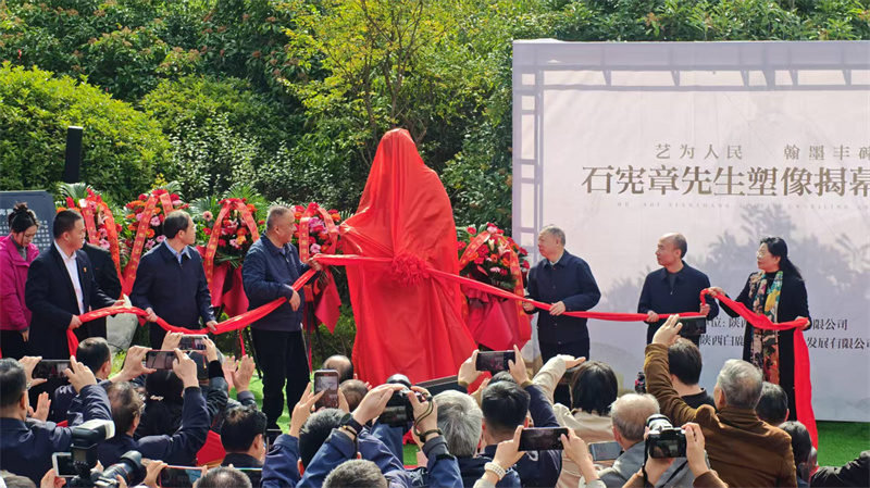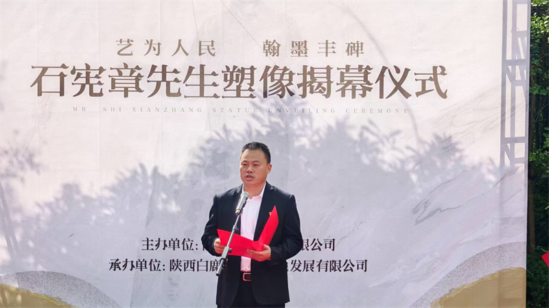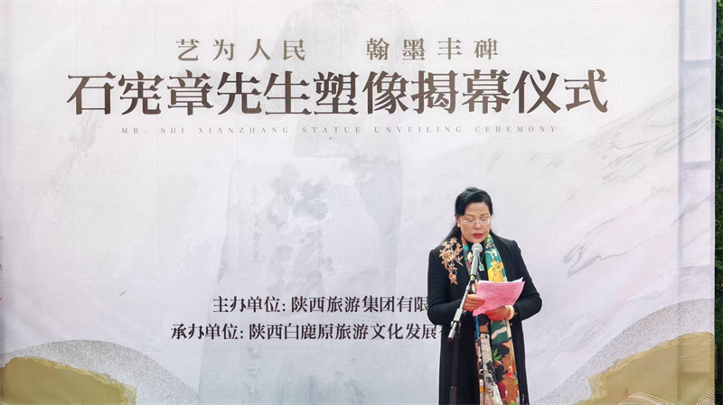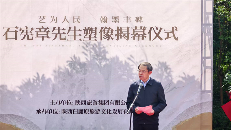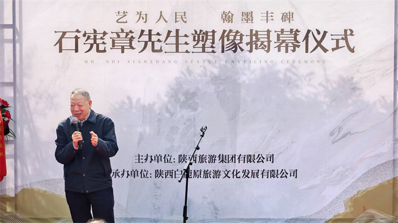 揭幕仪式现场庄重而温情,陕西白鹿原旅游文化发展有限公司总经理李陇安致欢迎辞。中国文学艺术基金会秘书长周冰在致辞中强调,石宪章先生塑像落地白鹿原影视城,是陕旅集团打造“艺术之原”战略的关键一步,也是陕西文化名人堂丰富艺术维度、拓宽文化覆盖面的重要举措;期待以塑像为纽带,让石宪章“扎根传统、守正创新”的艺术精神成为文旅场景的鲜活注脚,推动多元艺术在白鹿原交融共生。
