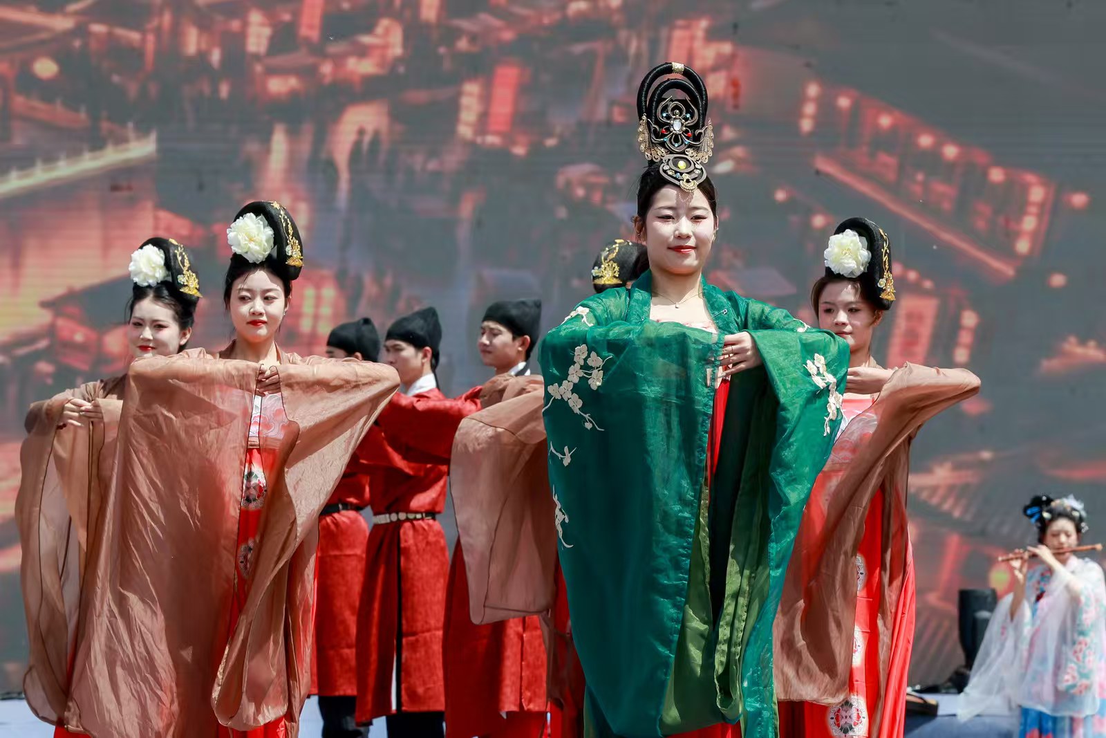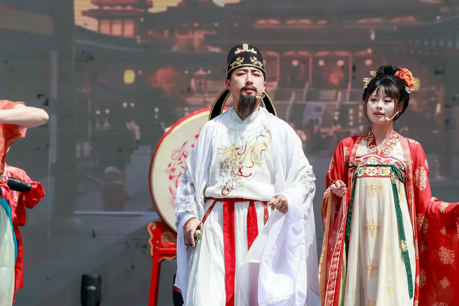 文旅推介诚意满满,文艺展演精彩纷呈。《敦煌飞天舞》衣袂翩跹,展示丝路石窟艺术的瑰丽神韵;原创情景演绎《千年浅水塬》穿越时空,艺术再现唐初浅水塬战役与大佛寺的深厚渊源;歌伴舞《彬州美》、原创舞蹈《柿园情》精彩上演,生动展现彬州秀美风光与柿园风情;压轴登场的《丝路回响》情景乐舞,生动勾勒出丝路文明交融共生的壮阔图景。