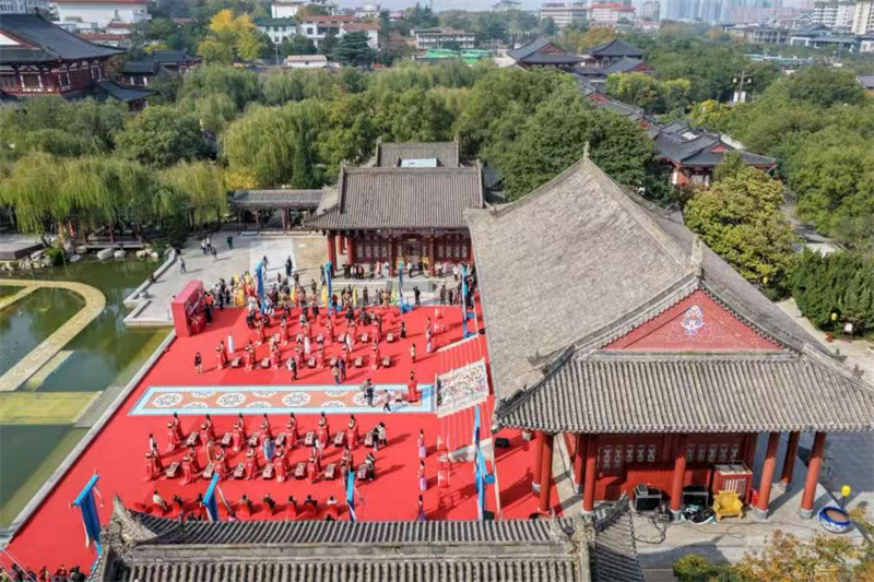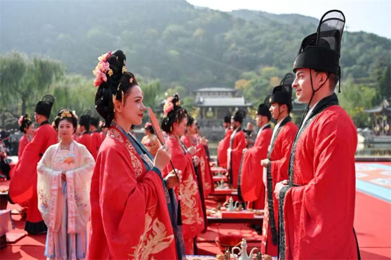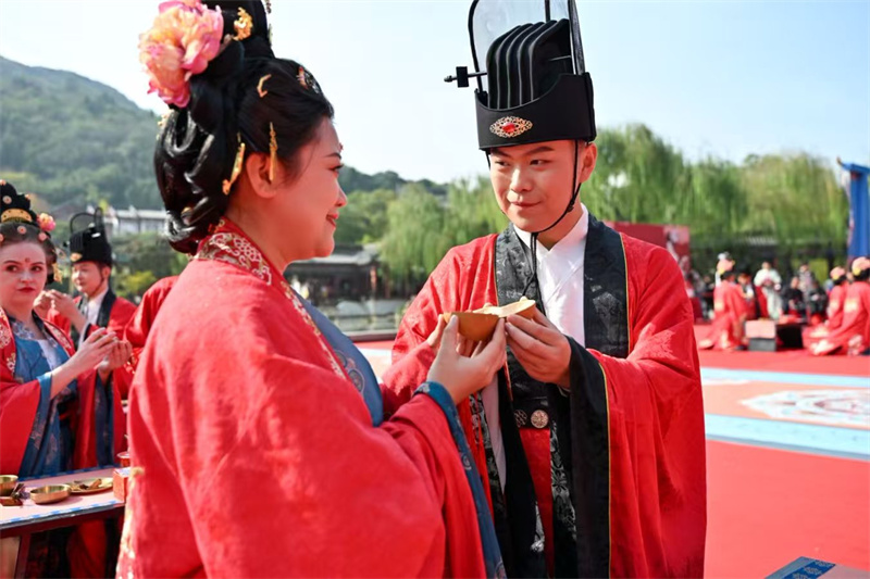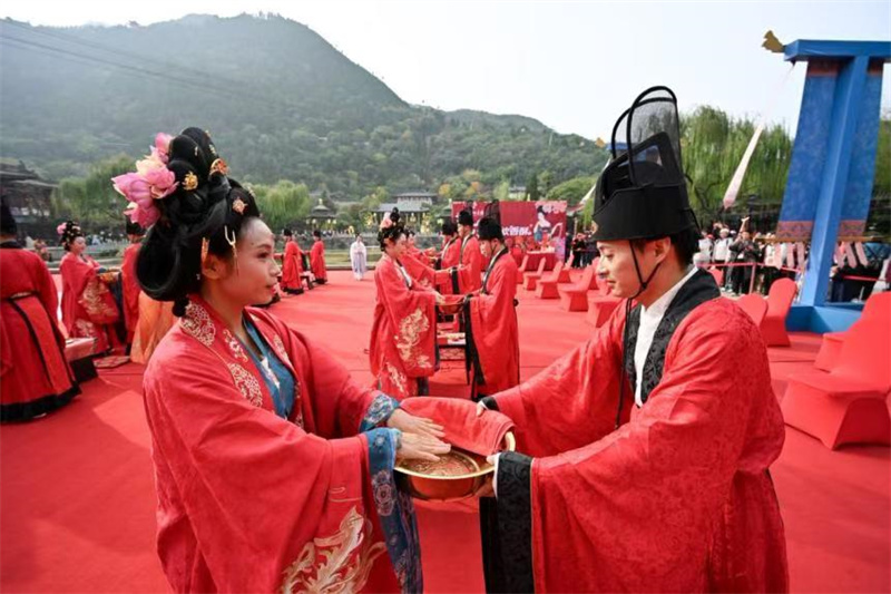 此次活动吸引30余对嘉宾参与体验,有来自全国各地的爱侣,还有来自泰国、俄罗斯、巴基斯坦等国家热爱中国传统文化的朋友。嘉宾身着精心复原制作的唐装华服,化精致唐妆,体验唐代婚仪。却扇、沃盥、拜天地、同牢、合卺、共结镜纽等富有文化内涵的仪式,让参与者深刻感受到中华传统文化的博大精深。