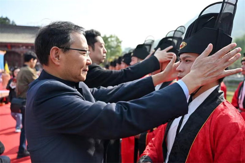 此次集体婚礼在正婚礼仪之前,特别设计“冠礼”“及笄礼”,深入体现中国“礼衣文化”。指导单位、主办单位领导及陕西文化界的观礼嘉宾为新人“加冠”“定簪”,送上美好祝福。